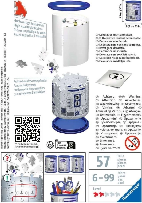 Stop met het zoeken naar pennen over het hele bureau! Deze RAVENSBURGER 3D-puzzel pennenhouder Star Wars biedt een praktische én leuke manier van organiseren. Je kunt hem leggen op motief voor de meer ervaren puzzelaars, of volgens de nummering op de achterzijde van de stukjes. Dankzij speciale gebogen stukjes van hoogwaardig plastic biedt deze houder niet alleen een prachtig design, maar ook stevige stabiliteit zonder lijm.