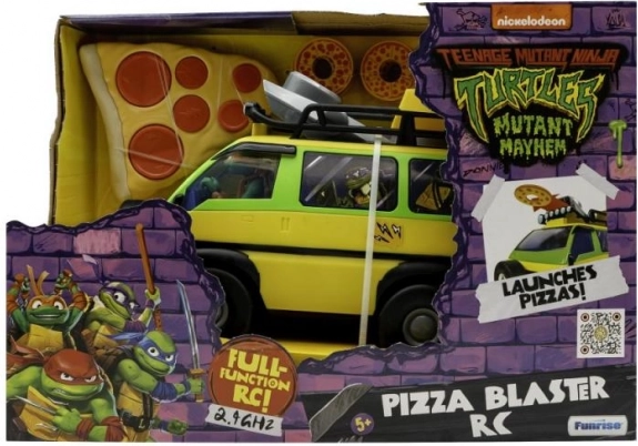 De RC auto Pizza Blaster is uitgerust met 2,4 GHz technologie voor gemakkelijk en soepel rijden. Met dit voertuig kun je tot wel 6 schuimpizza's naar je vijanden schieten en een wilde strijd beleven als echte Ninja Turtles! De grappige afstandsbediening in de vorm van een pizzapunt voegt een extra dosis plezier en eenvoud in bediening toe.