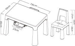 Het kunststof tafeltje met stoeltjes Neo biedt duurzaam kunststof en een moderne look die in elk kinderkamerinterieur past. De set is voorzien van twee praktische laatjes van 23 x 14 cm waarin kinderen kleine spulletjes kunnen opbergen.