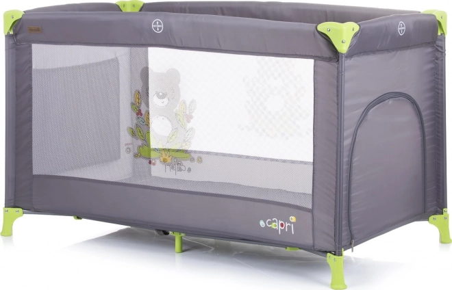 Reisbedje Chipolino Capri Graphite met snel inklappen, zij-ingang met rits, vakken en draagtas. Veiligheid volgens EN 716-1.