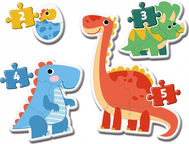 Kinderen vanaf 2 jaar kunnen genieten van het leggen van de eerste puzzels met als thema dinosauriërs. Elke puzzel bevat een verschillend aantal stukken - 2, 3, 4 en 5, wat een geleidelijke verbetering en ontwikkeling van nieuwe vaardigheden mogelijk maakt.
