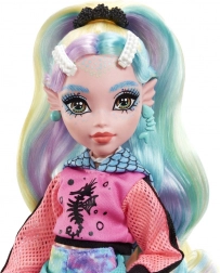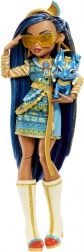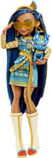 De Cleo De Nile pop uit de Monster High collectie schittert in een iconische outfit geïnspireerd op het oude Egypte: blauw‑gouden jurk met mouwen die aan verbanden doen denken, aangevuld met een kettingriem en kniehoge laarzen. De look wordt geaccentueerd door gouden sieraden en stijlvolle zonnebril.