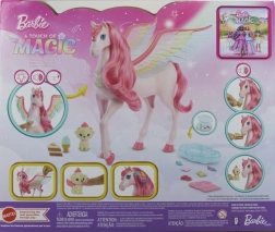 Laat je inspireren door de magische wereld van Barbie Touch of Magic en duik in fantastische avonturen met deze roze pegasus. Deze magische pegasus heeft twintig verschillende accessoires en licht- en geluidseffecten die op verschillende manieren worden geactiveerd.