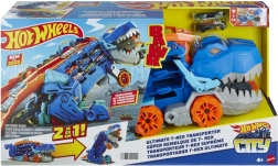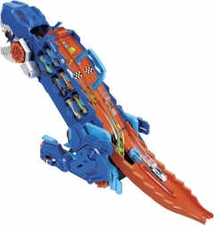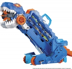 Op de rug van de T‑Rex bevindt zich een dubbele racebaan voor spannende duels. De winnaar rijdt door, terwijl de verliezer door de dinosaurus wordt “uitgeworpen” – ideaal voor competitief spel. Daarnaast kun je autootjes direct uit de bek lanceren voor extra actie. In de verpakking vind je 2 HOT WHEELS 1:64 autootjes, dus de fun begint meteen.