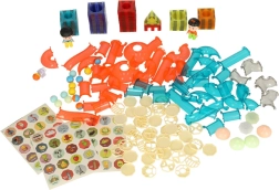 In de doos vind je knikkers, lichtgevende blokken, magnetische vormen, figuurtjes en stickers. Ideaal voor het maken van 2D/3D bouwwerken en urenlang speelplezier.