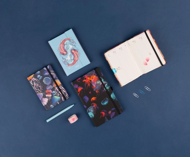 Formaat 13 × 21 cm, een elastische band voor veilige sluiting en een praktische pennenlus om overal te kunnen werken.
