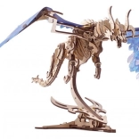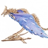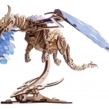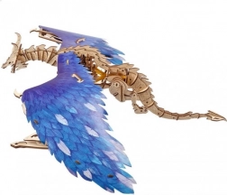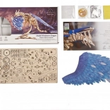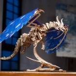 Laser-gesneden onderdelen van multiplex passen exact in elkaar en creëren een realistisch draakmodel met opvallende blauwe vleugels, klaar om te stralen op de stand of in actie.