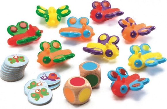 Dit eenvoudige en boeiende spel ontwikkelt bij kinderen het kleurenzicht en het vermogen om zich te concentreren. De speler gooit twee gekleurde dobbelstenen en zoekt snel de vlinder die beide getoonde kleuren bevat. Wie hem als eerste pakt, krijgt een overwinningsfiche. Ideaal voor samen spelen in het gezin en in de kleuterklas.