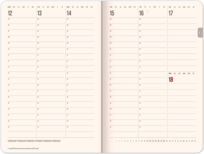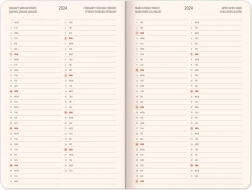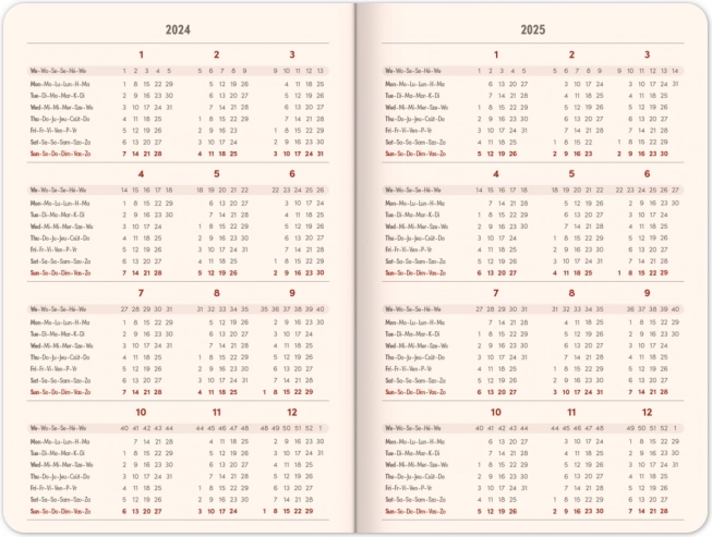De wekelijkse kolomindeling biedt voldoende ruimte voor notities elke dag. In de agenda vind je een overzicht van internationale feestdagen, een lijst met Tsjechische en Slowaakse namen, jaaroverzichten 2024 en 2025, een handig adresboek en een vakje op het achterste schutblad voor kleinigheden.