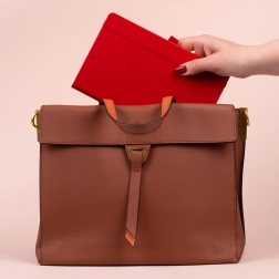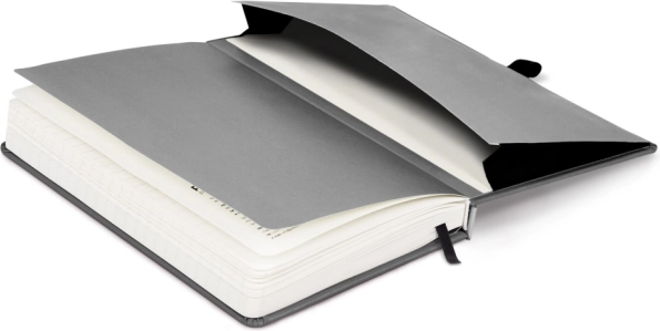 Stoffen bladwijzer voor snelle terugkeer naar belangrijke pagina’s en een binnenvak voor losse papieren of visitekaartjes.