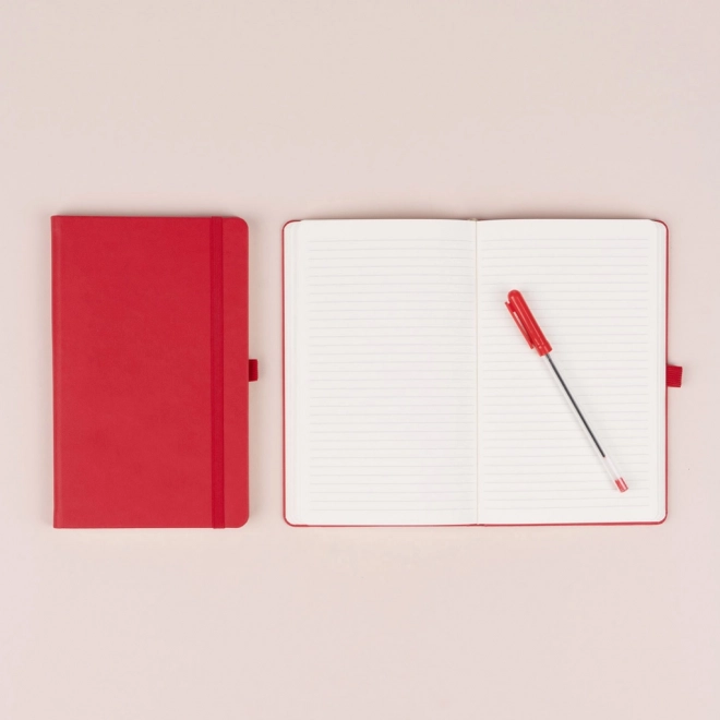 Elegant gelijnd notitieboek in klassieke rode kleur met een harde boekgebonden kaft, elastische sluiting, pennenlus en stoffen bladwijzer. Het oppervlak met grovere structuur is ideaal voor foliedruk van een logo; lijnen van 6 mm op hoogwaardig geel papier zorgen voor comfortabel schrijven thuis, op kantoor en onderweg.
