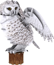 Het 3D-model van de sneeuwuil, met gedetailleerde veren en levensechte ogen, valt op door zijn realistische uitstraling.