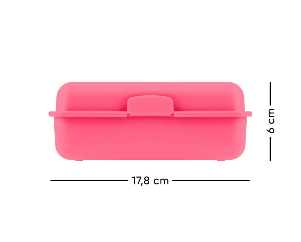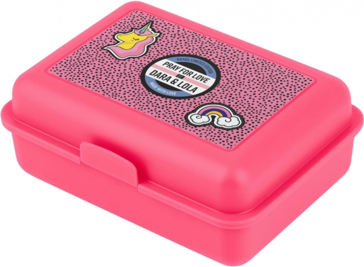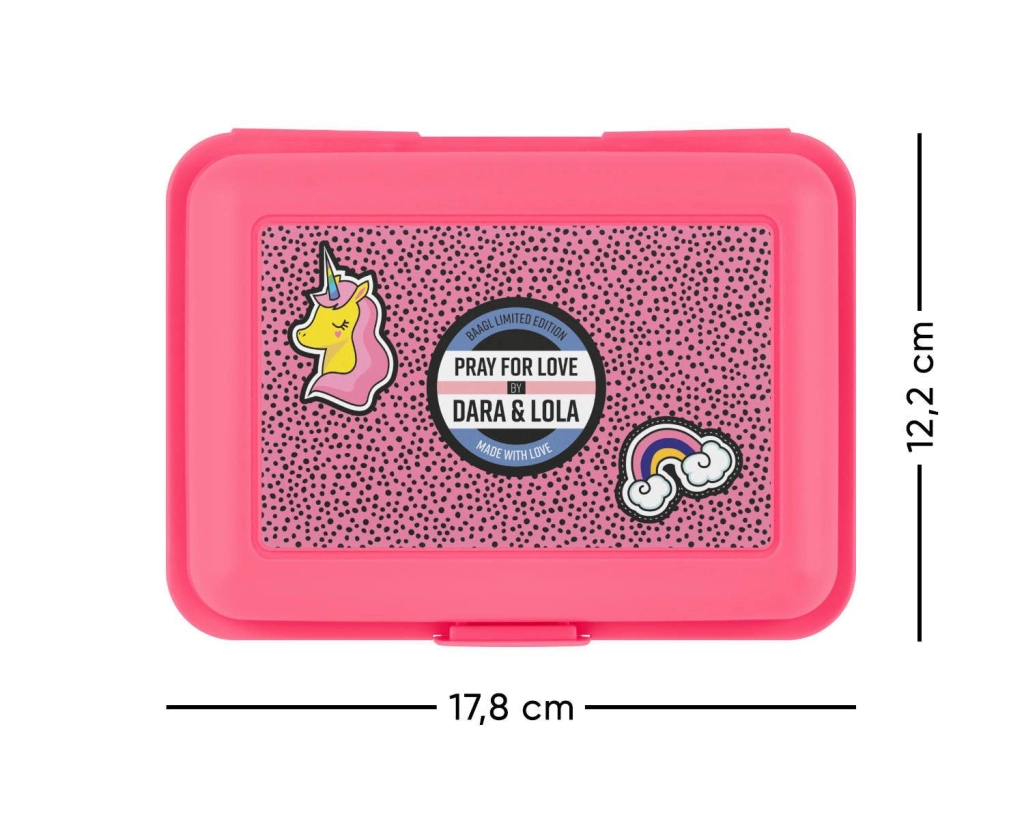 • Praktische kunststof lunchtrommel met een motief ontworpen door de dochter van Dara Rolins en een sluiting met één clip
