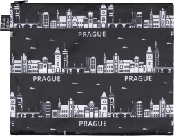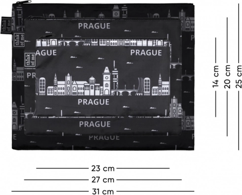 Elk etui heeft een praktische bovenzijde met ritssluiting en een contrasterende print met het panorama van PRAAG. Dankzij de zwarte kleur en het tijdloze design combineer je ze eenvoudig met elke bagage. De set is ook perfect als stijlvol souvenir of cadeau voor liefhebbers van de stad.
