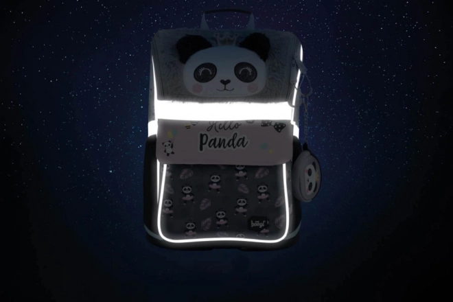 De set bevat ook een klassiek eenlaags etui met twee kleppen en een kwaliteitsrits, en een praktische zak van stevig, afwasbaar materiaal met een voorvak met rits. De hele set is versierd met het populaire pandamotief en is voorzien van reflecterende elementen voor betere zichtbaarheid.
