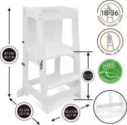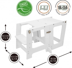 De leertoren 3in1 wit biedt veelzijdigheid dankzij drie verschillende configuraties: toren, tafel en stoel. Gemaakt van hoogwaardig en duurzaam multiplexmateriaal, is het eenvoudig te monteren en heeft het een maximale draagkracht tot 50 kg.