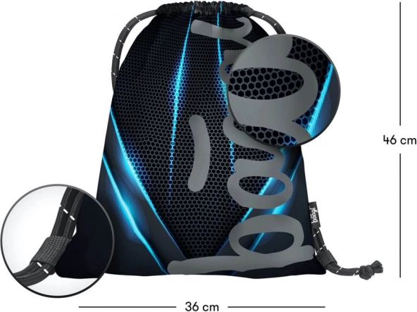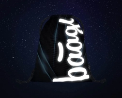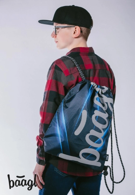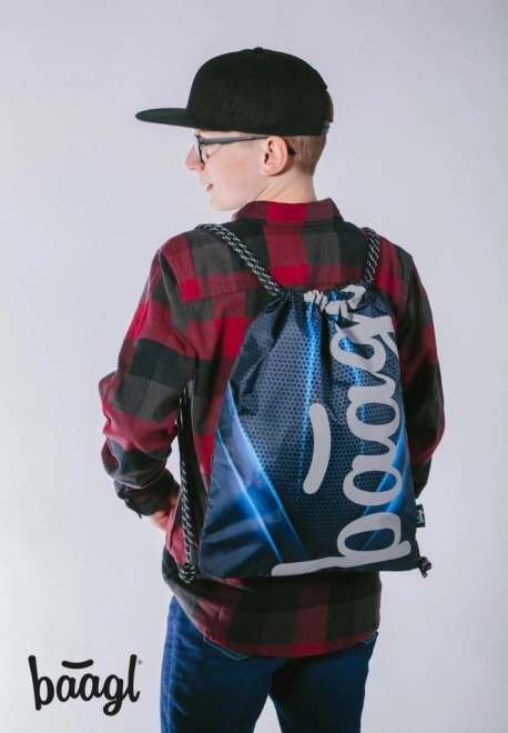 Praktische trekkoordzak BAAGL voor dagelijks gebruik naar school en sport. Gemaakt van een stevig, afwasbaar materiaal, met een oplichtend logo in het donker en duurzame koorden voor comfortabel dragen op de rug.