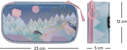 De Baagl Skate Moon etui valt op door een modern design met een motief van bergen en een planeet in een blauw-roze kleurcombinatie. Dankzij de stevige rits en het duurzame materiaal beschermt hij je schrijfwaren en kleine schoolspullen veilig.