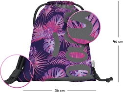 De gymsack heeft een aantrekkelijk tropisch motief in roze en paarse tinten dat de aandacht trekt.