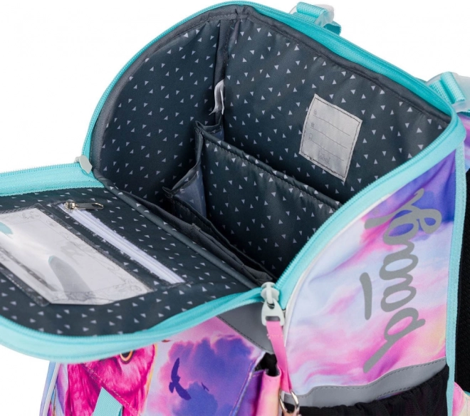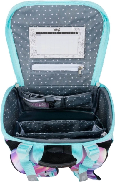 De tas beschikt over een nieuw klepmechanisme voor het openen, waardoor je direct vanaf de schoolbank gemakkelijk bij je spullen kunt. Binnenin vind je een transparant vak met rooster/lesrooster, een interne organizer met elastiek en zijvakken van stevig gaas, geschikt voor een drinkfles.