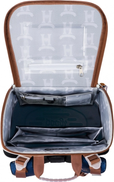 De tas heeft een modern vouwsysteem dat kinderen gemakkelijk toegang biedt tot schoolspullen rechtstreeks vanuit hun bureau. Binnenin vindt u een transparant vakje met rooster en een organizer voor een gelijkmatige gewichtsverdeling, aangevuld met een elastiek voor fixatie.