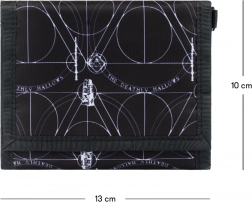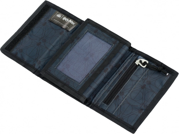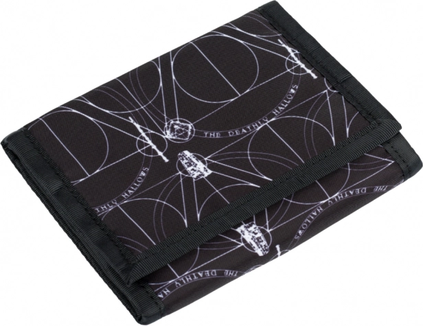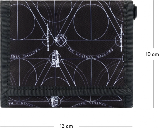 De portemonnee is versierd met het motief van de Relieken van de Dood, een onweerstaanbare blikvanger voor fans van de tovenaarsreeks.
