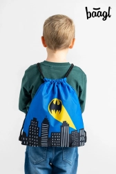 De blauwe zak is versierd met het iconische Batman logo en een uniek stadsontwerp.