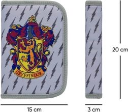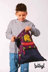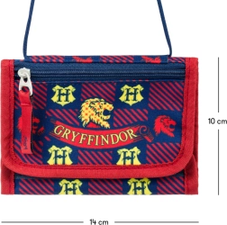 De set wordt aangevuld met een eenlaagse etui met twee flapdelen (zonder inhoud), een gymsack voor gym/binnenschoenen met voorvak met rits en koordsluiting om op de rug te dragen, mappen voor schoolscriften met binnenflap en elastiek, en een nekportemonnee met klittenbandsluiting en muntvakje. Alles in het Gryffindor-thema voor een stijlvolle schoolstart.