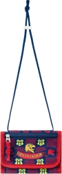 Etui met twee flapdelen, gymsack voor binnenschoenen met voorvak met rits, mappen voor schriften en een nekportemonnee – alles in de kleuren en met het embleem van Gryffindor.