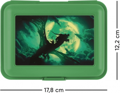 Het ontwerp met een draak die naar de vollemaan vliegt geeft de lunchbox een unieke en aantrekkelijke uitstraling.