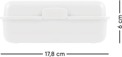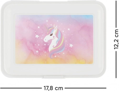 Witte plastic doos met eenhoorn in pastelkleuren op het deksel, speciaal ontworpen voor kinderen.