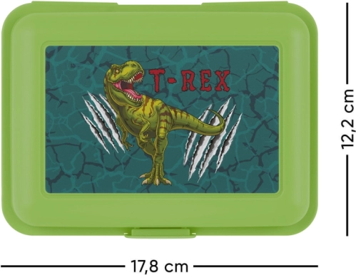 De lunchbox heeft een opvallend T-Rex ontwerp op het deksel, aangevuld met de rode tekst 'T-REX', wat het extra aantrekkelijk maakt voor kinderen.