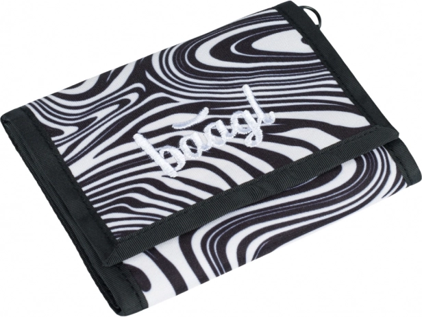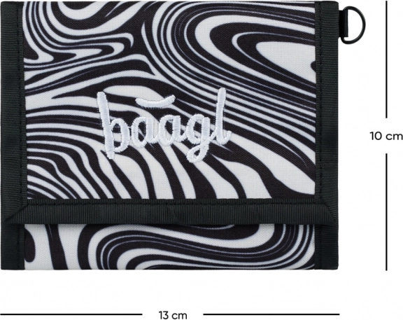 Deze BAAGL-portemonnee biedt een unieke combinatie van stijl en functionaliteit. Dankzij het stevige en duurzame materiaal is hij ideaal voor school en dagelijks gebruik. Hij is versierd met een zwart-wit abstract patroon en subtiele geborduurde tekst aan de voorzijde.