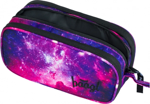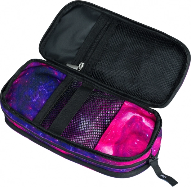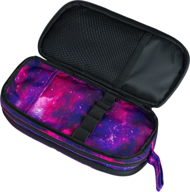 De Studente-etui Galaxy combineert functionaliteit en stijl met een uniek galaxydesign in paarse en roze tinten. Gemaakt van hoogwaardig textiel, biedt het drie afzonderlijk afsluitbare compartimenten met rits voor eenvoudige verdeling en organisatie van uw spullen. De buitenkant is gemaakt van duurzaam materiaal dat de inhoud van de etui beschermt. Dankzij de overzichtelijke interne indeling vindt u ruimte voor verschillende accessoires, zoals gummen, slijpers en andere schoolbenodigdheden. Een praktisch lusje zorgt ervoor dat de etui gemakkelijk kan worden gedragen of aan een rugzak kan worden gehangen.