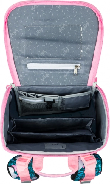 Binnenin vind je een overzichtelijke organizer met elastiek voor het vastzetten van schriften en een transparant vak voor het lesrooster. De zijvakken van stevige mesh bieden plaats aan een drinkfles; de voorste geïsoleerde zak met gesp houdt de snack veilig. Waterafstotende materialen, een stevige bodem voor zelfstandig staan en reflecterende elementen verhogen zowel duurzaamheid als veiligheid.