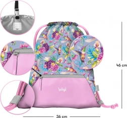 Praktische sporttas Baagl met kolibrie-motief, ideaal voor gymschoenen, schoeisel en vrijetijdsactiviteiten. Gemaakt van een duurzaam afwasbaar materiaal, met een praktisch voorvak met ritssluiting en stevige koorden voor comfortabel dragen op de rug. Dankzij de karabijnhaak bevestig je hem eenvoudig aan de schooltas.