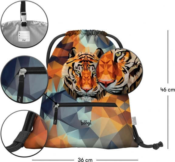 Praktische zak met tijgermotief van het merk Baagl, ideaal voor vrijetijdsactiviteiten of als schoenenzak. Biedt eenvoudig dragen dankzij verstelbare koorden en een praktisch ritsvakje voor het org... Meer tonen