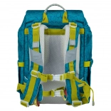 De praktische indeling met één compartiment maakt oriënteren eenvoudig; aan de rugzijde zit een vak voor het vastzetten van mappen. Het voorvak met rits biedt veilig plaats aan een broodtrommel, de zijvakken met elastiek houden de fles op zijn plek. De magnetische sluiting is voor kinderen heel eenvoudig, reflecterende elementen verhogen de zichtbaarheid in het schemer en het waterafstotende materiaal beschermt de inhoud bij ongunstig weer.