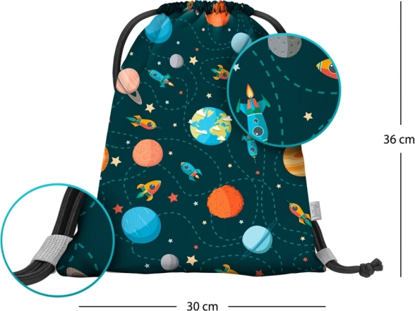 De lichte en praktische voorschoolse zak Baagl met het motief Planeten is ideaal voor schoenen en kleine spullen voor clubjes en vrije tijd. Gemaakt van stevig, afwasbaar materiaal, met sluiting door middel van stevige koorden, die tevens comfortabel dragen op de rug mogelijk maken.