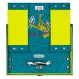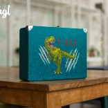 Stijlvolle schoolkoffer met T‑REX-motief van stevig gelamineerd papier biedt een opvouwbare constructie met drukknoopjes, duurzaam metalen beslag met verstevigde hoeken en een metalen handvat voor comfortabel dragen. De veilige sluiting met gesp beschermt de inhoud en het opvallende turkoois‑gele design zal elke scholier bevallen.