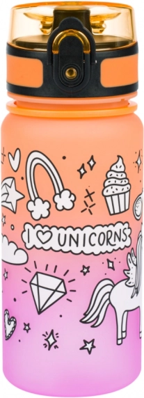 Stijlvolle tritan drinkfles met een inhoud van 350 ml met een eenhoornmotief en kleurverloop, ideaal voor school, uitstapjes en sport. Biedt een veilig vergrendelbaar deksel, een praktisch draaglusje en een inwendig zeefje voor fruit of kruiden. Gemaakt van gecertificeerde BPA-vrije tritan, geurloos en geschikt voor hete dranken.