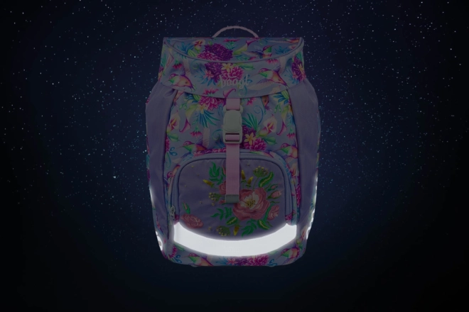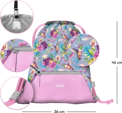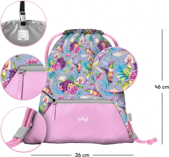- Design: speels kolibrie- en bloemenmotief, bijpassende rugzak, etui en gymsack.