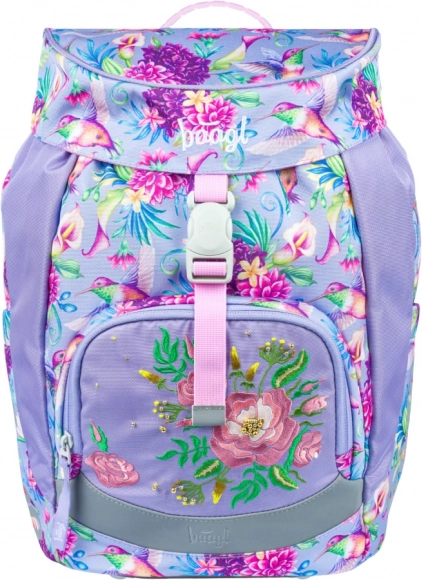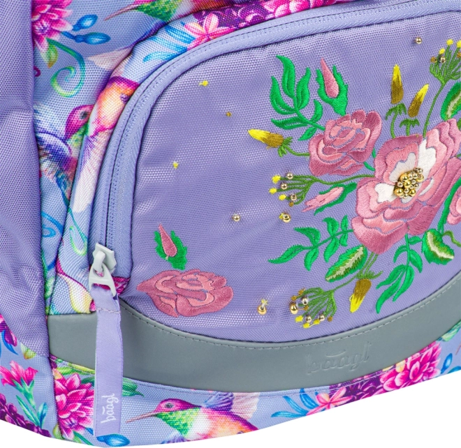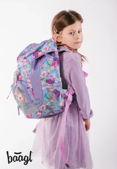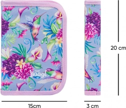 Lichte en comfortabele BAAGL-schoolset voor de onderbouw, met een ultralichte Airy-rugzak, een praktisch etui met twee flappen en een duurzame gymsack voor pantoffels of gym. Ergonomische rug met Airflow Ergo-systeem, reflecterende elementen, magnetische sluiting en waterafstotend materiaal zorgen voor veiligheid, comfort en een lange levensduur in een prachtige kolibrie- en bloemenprint.