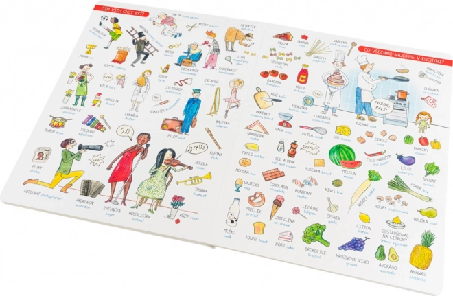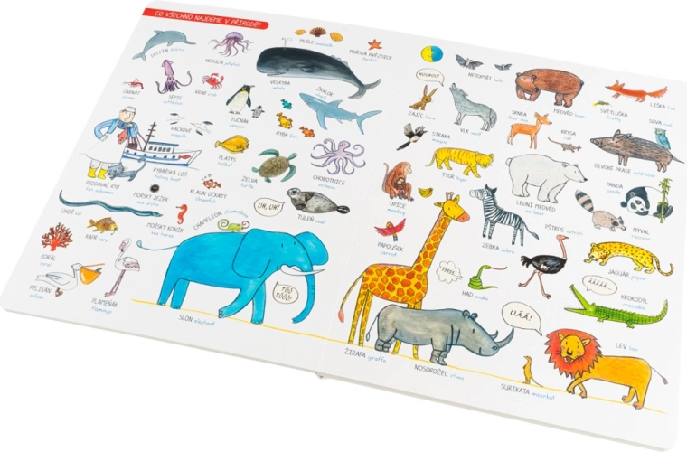 Dit grote prentenboek met vrolijke, kleurrijke en “leesbare” illustraties kan jonge lezers begeleiden gedurende de hele peuter- en kleuterperiode en misschien nog langer... Het biedt eindeloze toepassingsmogelijkheden. Het kind leert eerst de afzonderlijke voorwerpen op de afbeeldingen herkennen en benoemen, en later onthoudt het de gedrukte vorm van de woorden. De allerkleinsten kunnen ermee kleuren leren herkennen, voor de iets ouderen dient het als basis voor de eerste leespogingen of voor het schrijven van blokletters. Het kan je bovendien inspireren tot allerlei spelletjes om het kortetermijngeheugen te trainen en het zit ook boordevol verhalen – je hoeft de afbeeldingen alleen maar tot een verhaallijn te verbinden – de verbeelding kent geen grenzen! En voor de allernieuwsten zijn alle woordjes zelfs naar het Engels vertaald – en leren en spelen kunnen opnieuw beginnen!