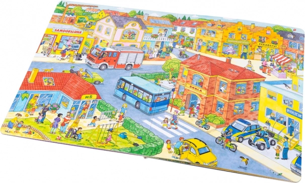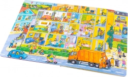 Dit grootformaat boek is ideaal om samen te lezen en te vertellen. Kinderen ontdekken wat er in de stad gebeurt van ’s morgens tot ’s avonds – van het werk van de vuilnismannen en boodschappen doen, via de peuterspeelzaal/kleuterschool, de bouwplaats, brandweer en politie, tot aan middagpret in het park en uitstapjes naar het meer of de boerderij. Elke pagina staat vol aanknopingspunten om te praten en details te zoeken.
