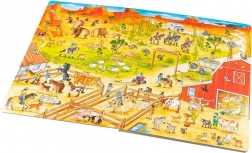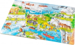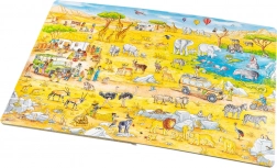 Elke scène toont een andere omgeving – bos, veld, stad, zee, oceaan, regenwoud, savanne, woestijn en poolgebieden. Aan het einde van het boek wacht een overzicht van alle afgebeelde dieren, dat helpt kennis te verankeren en natuurlijk leren over de natuur stimuleert.