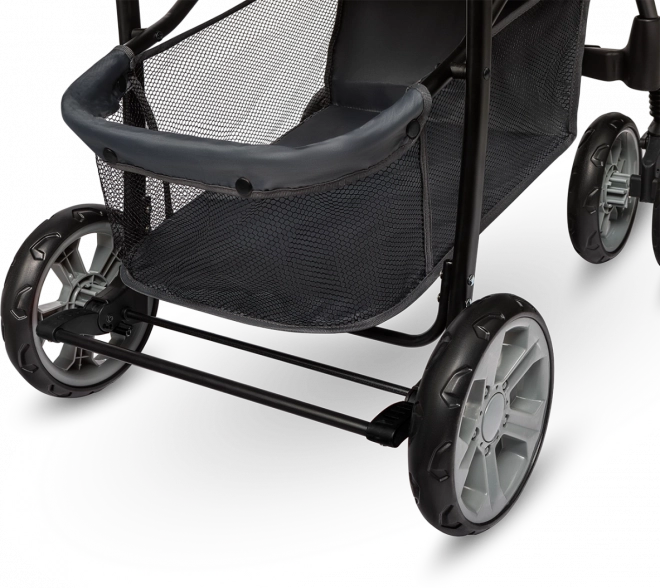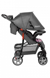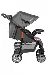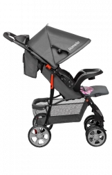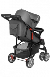 Veiligheid staat voorop: vijfpuntsgordels met zachte pads, een bumper met tray en bekerhouder en testen volgens norm EN 1888 (SGS-lab) geven zekerheid bij dagelijks gebruik. Wendbare EVA-wielen met zachte vering op de vooras absorberen oneffenheden, manoeuvreren makkelijk door de stad en de vergrendeling voor rechtuit rijden houdt een stabiele koers op bestrating.