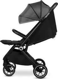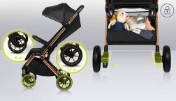 Voor maximaal comfort van het kind zijn er een verstelbare rugleuning tot vlakligstand, een verstelbare voetsteun van eco-leer en een XXL waterdichte kap met UPF50+-filter en kijkvenster. Ouders waarderen het automatisch inklappen met een knop, de praktische draagriem, de ruime mand (draagvermogen 3 kg) en het click&ride-systeem voor een comfortabele pas en een betrouwbare voetrem.