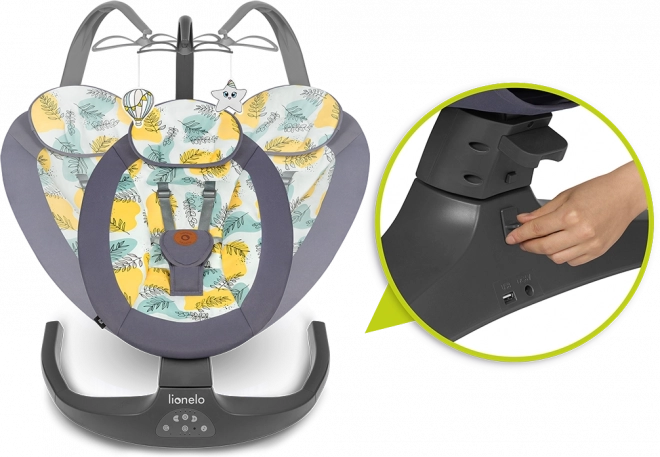 Praktische 2-in-1 wipstoel en schommel LIONELO Ralf biedt zachte schommelbeweging van rechts naar links, 2 rugleuningstanden, automatische bewegingsdetectie en een stille motor. Met 5 schommelsnelheden, een timer van 8/15/30 min en 12 melodieën stelt hij je baby gemakkelijk gerust. 5-puntsgordels zorgen voor veiligheid, terwijl een zacht kussentje en een makkelijk wasbare bekleding comfort bieden. Voeding mogelijk via batterijen of USB.