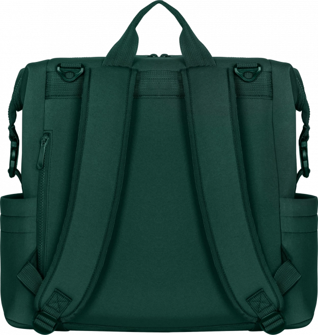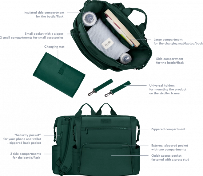 De rugzak kan op de rug worden gedragen, aan de kinderwagen worden bevestigd met behulp van afneembare universele riemen, of als losse accessoire worden gebruikt. Het verschoningsvak kan ook dienen als compartiment voor een tablet of laptop, terwijl de zij- en binnenvakken alles binnen handbereik houden. Dankzij de riemen kun je de afmeting verkleinen zodat de rugzak zelfs onder de stoel in het vliegtuig past.